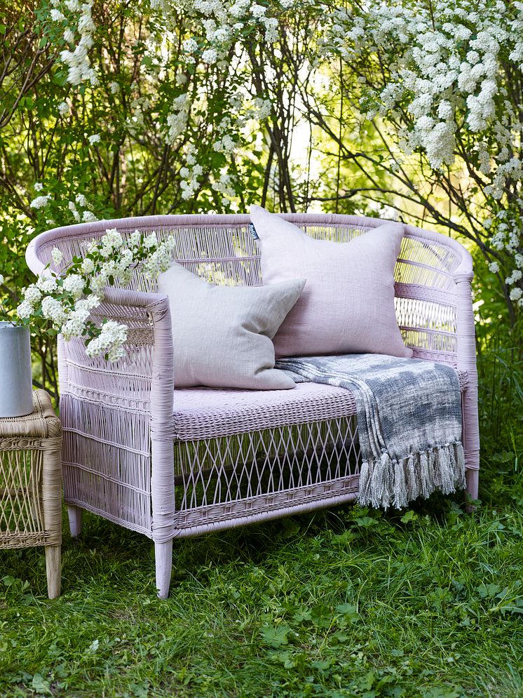 Grønt + rosa = sant: Grønt og rosa er komplementærfarger. Marmor FR1171 er helt perfekt mot den grønne naturen, bare se selv hvor fint denne sprøytemalte, rosa sofaen står med naturen som bakteppe.