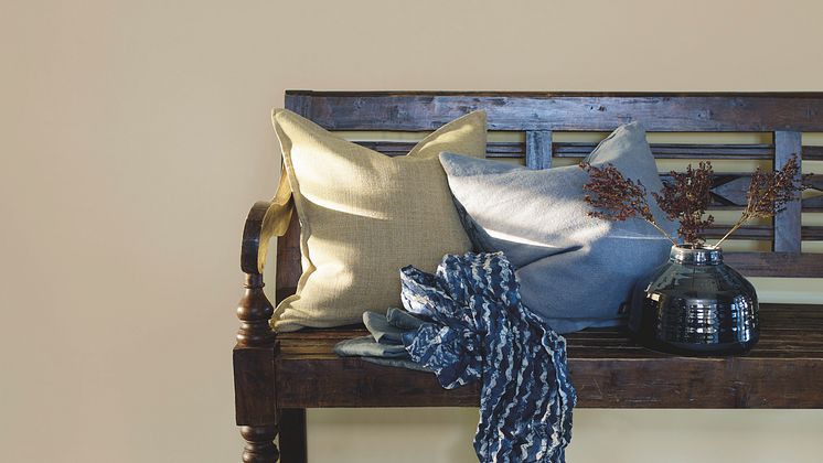God kombinasjon: Elvesand er en lys beige tone med et gyllent slør, og den passer perfekt på stueveggene. Her har vi brukt interiørartikler i samme farge-familie, men i mørkere toner. Det gir en trygg kombinasjon og balanse mellom fargene.